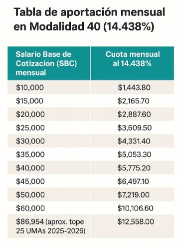 A partir del año 2026, la cuota de aportación mensual en la Modalidad 40 que cubren los asegurados al IMSS subirá al 14.438% del salario registrado que elijas para cotizar dentro de este régimen.